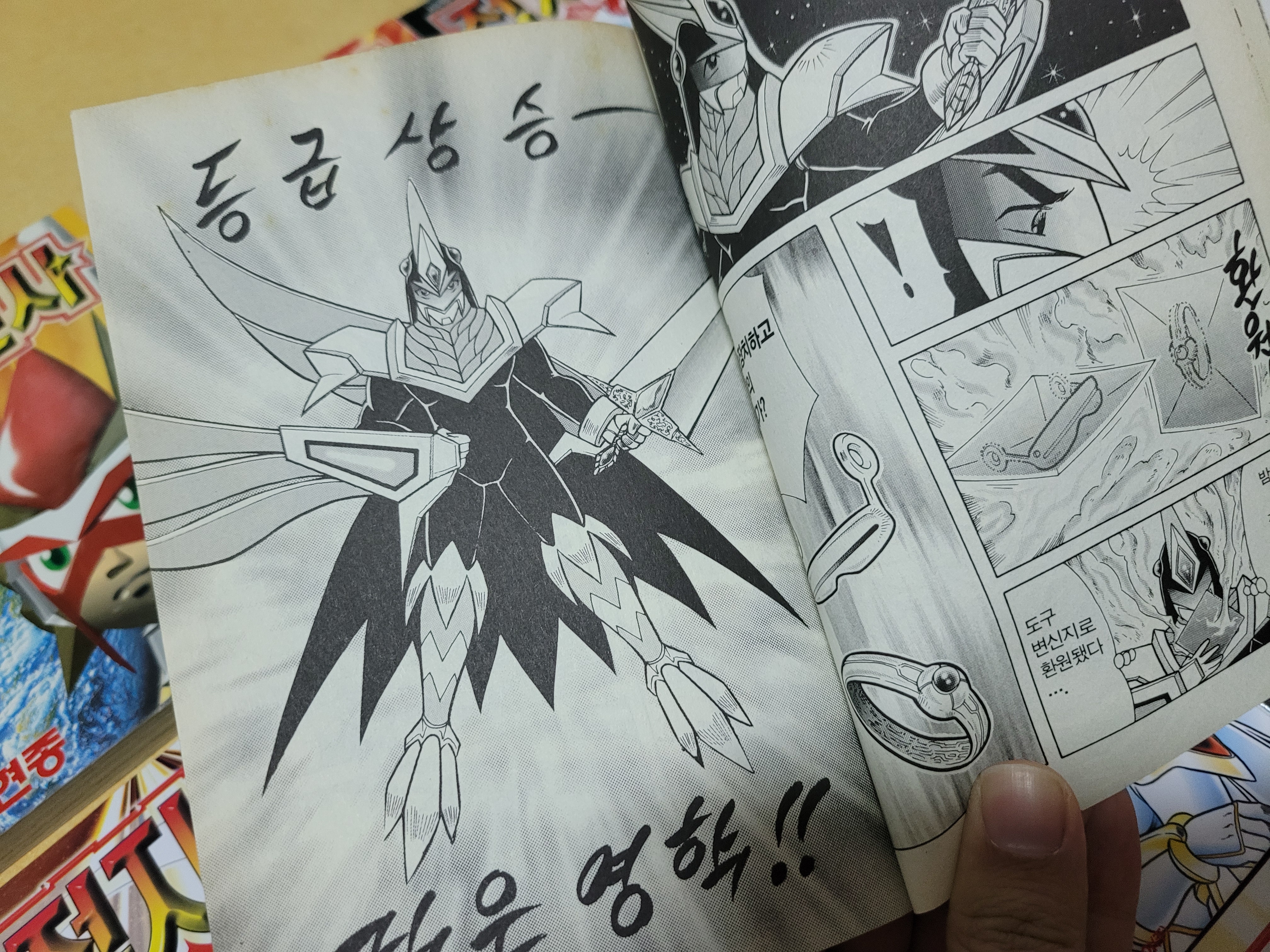 제가 인생에서 가장 처음 산 만화책이 접지전사 4권입니다. 4권은 점점 이야기가 고조되며 액션과 함께 등급변화가 이루어집니다. (등급은 자주, 파랑, 남색, 녹색, 노랑, 주황, 빨강, 하양, 회색, 검정, 은색, 금색으로 나뉩니다.)