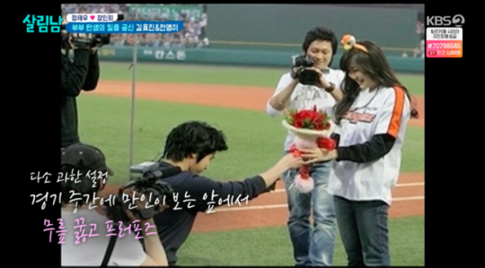 2007년 아내에게 프로포즈를 했었는데요. 두산 베어스와 한화 이글스 야구 경기 도중 프로포즈를 했었어요.