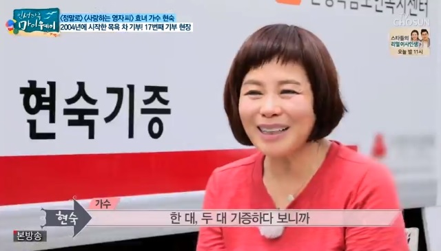 그동안 많은 기부 활동 및 봉사활동을 해 온 가수 현숙이에요.